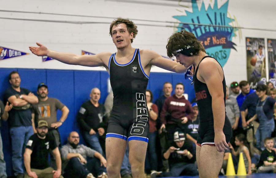 Cram pinned his first three opponents, but he had to fight off a near pin in a tough semifinal match vs. Mill River’s Toby Pytlik to reach the final, where he wrapped up his perfect season with a solid decision.