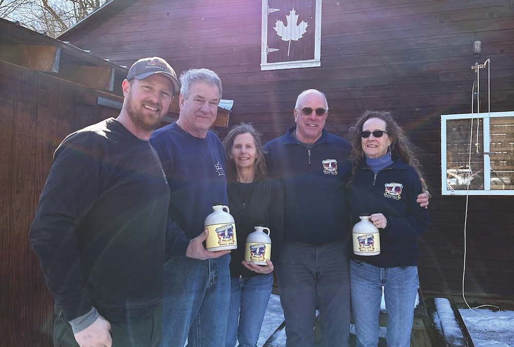 BRIAN HEFFERNAN, LEFT, and his parents, Bill and Julie, stand alongside Hillsboro Sugarworks founders and former owners Dave and Sue Folino. The Folinos recently sold their Starksboro sugarworks to the Heffernans, who run a maple farm a few miles south on Hillsboro Mountain.