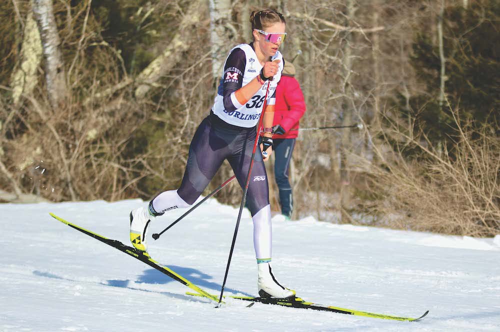 TIGER AVA SCHNEIDER picks up speed on a downslope on the way to her second-place finish in the girls’ classic 5K at Riker Outdoor Center. She helped MUHS to a big lead Tuesday in the first day of the Nordic state meet.