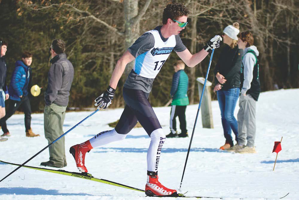 MIDDLEBURY UNION HIGH School senior Baxter Harrington finished sixth in the boys’ 5K and helped the Tiger relay team finish second at the Rikert Outdoor Center on Tuesday. The MUHS boys are in second after the first leg of the two-day state Nordic ski meet.