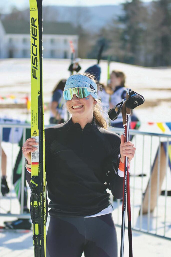 MUHS JUNIOR BETH McIntosh smiles after winning the girls’ classic 5K by a big margin on Tuesday’s first day of the state Nordic skiing meet, hosted by the Rikert Outdoor Center.