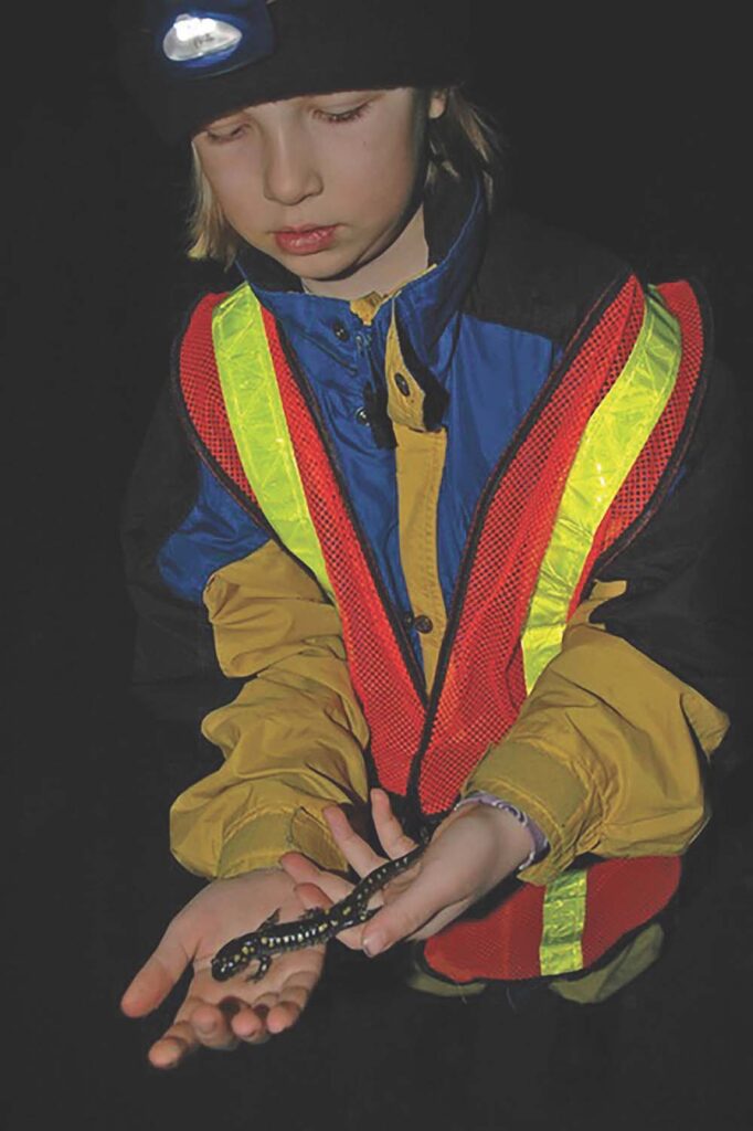 At the most dangerous crossings amphibians may suffer 50 percent mortality, but the crossing we monitor has little traffic. This Salisbury site retains not only large numbers of amphibians but also remarkable species diversity: four salamander and three frog species. If we happen to get a “Big Night”, we could move more than a thousand amphibians in a two-hour period. The site affords all who participate an opportunity to experience this remarkable natural phenomenon first-hand.
