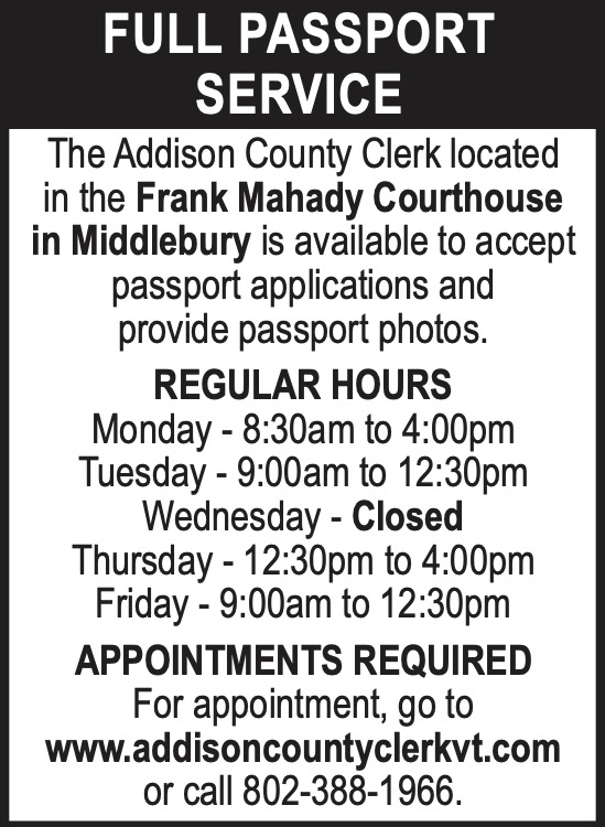 Addison County Courthouse Passports Mar 14, 2024 | Addison County Courthouse Addison County Courthouse Addison County Courthouse Passports March 14, 2024 Share this story: This article’s tags: Legals More News Addison County Courthouse Addison County Clerk Full Passport Service Addison County Courthouse Addison County Annual Budget Meeting AC Courthouse 121125 3×5.25 Addison County Courthouse Addison County Budget Discussion AC Courthouse 112025 2×1.75 Budget Discussion Share this story: