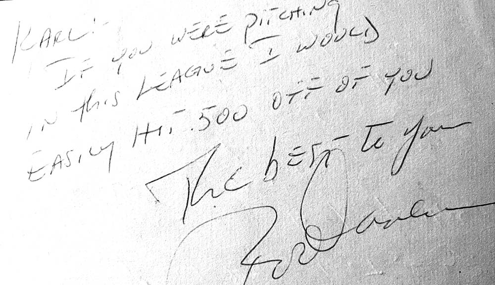 A few years later, 1977, Rod Carew was attempting to be the first hitter to bat .400 since Ted Williams did it in 1941. I got this note that summer: “Karl — If you were pitching in this league I would easily hit .500 off of you. My best to you, Rod Carew.”