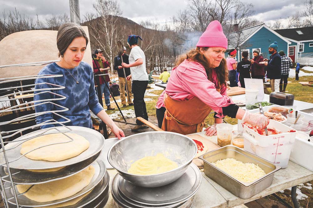 SHARI BROWN AND Emily Rockwell prepare the pizza at the 2024 Blueberry Hill Outdoor Center Pig Race, a revival of a fun community race that started in 1972.