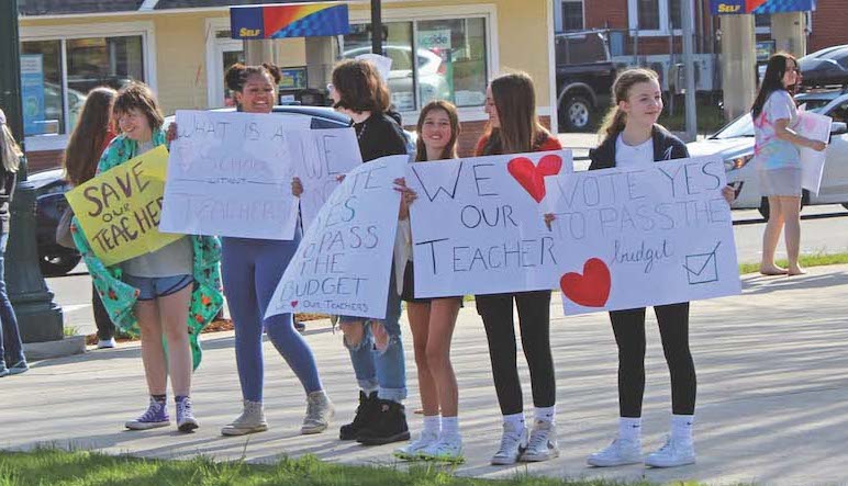 Around two dozen Mount Abraham Union Middle School students and community members gathered on the Bristol Town Green on Monday to protest potential layoffs and encourage voters to support district teachers by passing the next budget proposal.