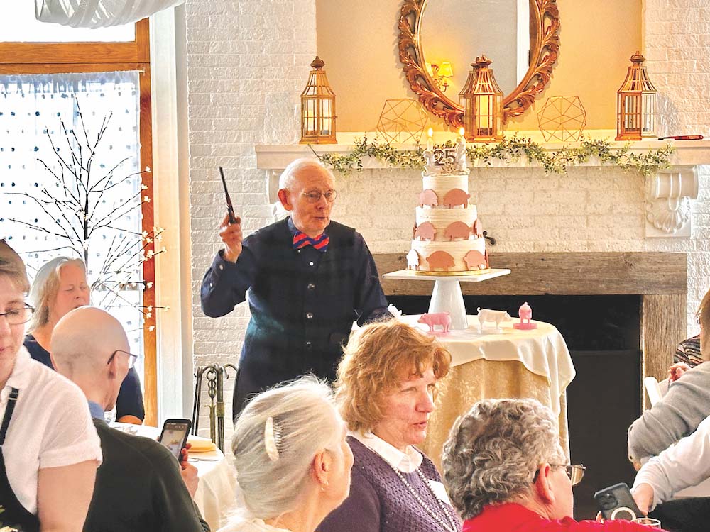 ARTIST WARREN KIMBLE, one of the founders of the Brandon Artists Guild, leads a celebration of the Guild’s 25th anniversary at the organization’s annual dinner at the Lilac Inn in Brandon on March 25.