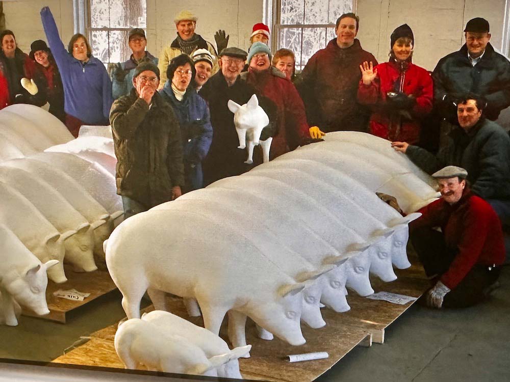 Kimble recruited 40 artists from Brandon and its environs to decorate life-size fiberglass pigs. They were able to raise $20,000 from local sponsors in two weeks to pay for the plain statues (at $500 a pop).