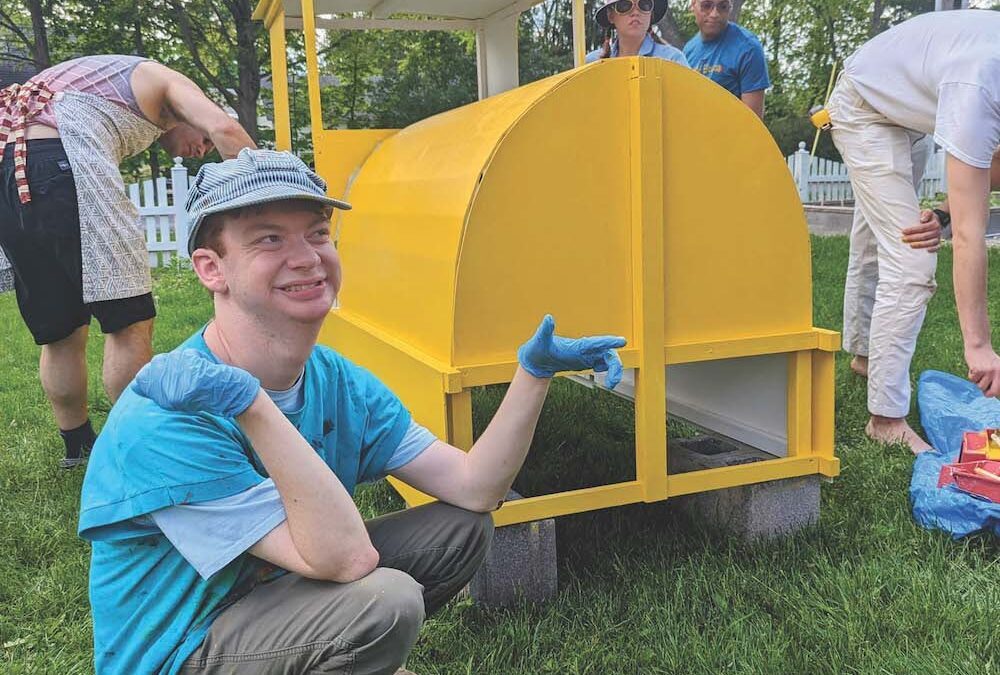 Yellow House resident Pierce Murray inspired the creation. A lover of trains and big fan of Thomas the Tank Engine, Murray often wears a well-loved blue and white striped engineer hat. He donned it on this past Friday afternoon, when the Yellow House team gathered on the lawn of their Middlebury home to paint the Memorial Day train.