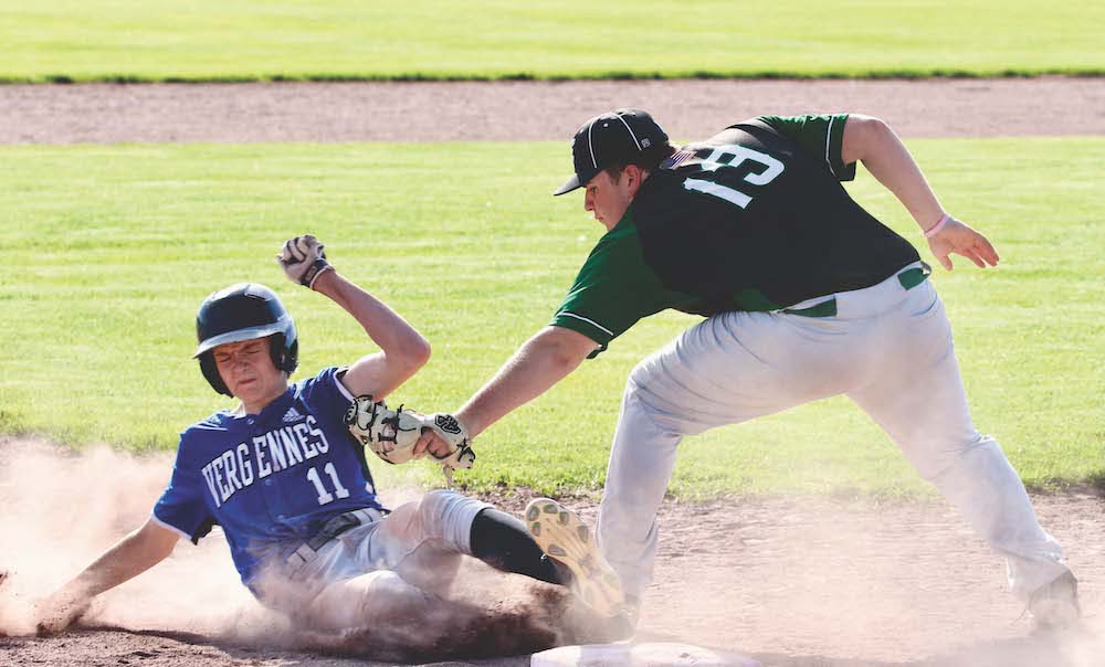 COMMODORE OUTFIELDER CARTER McGuire is tagged out trying to take third during the VUHS baseball team’s May 23 home win over Enosburg.