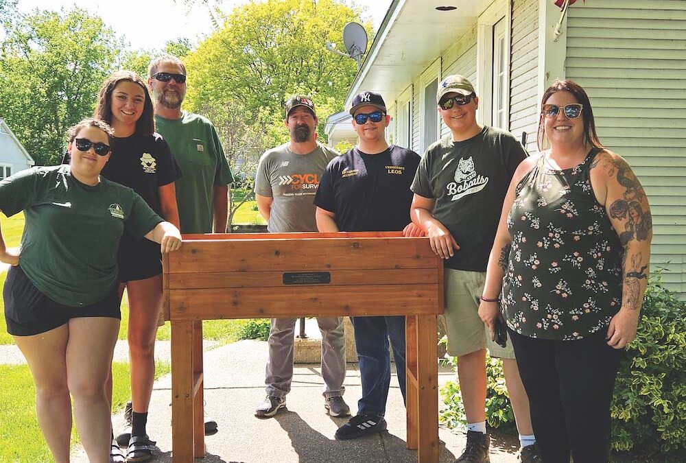 THE LEOS YOUTH club recently built and installed a half-dozen raised garden beds for elderly and/or physically challenged residents of city apartments and the John Graham Shelter. The Vergennes-area youngsters got help from parent builders and donations from landscaping companies and Women of Wisdom. Pictured, left to right, are Leo McKenzie Flint, Leo Scout Jacobson, Leo mentor/parent Eric Jacobson, Leo mentor/parent Chris Clair, Leo Ben Hargett, Leo Wilder Jacobson, Summit Properties Manager Carly Lehrer. Leos Collin Clair and Megan Mentzer also worked on the project.
