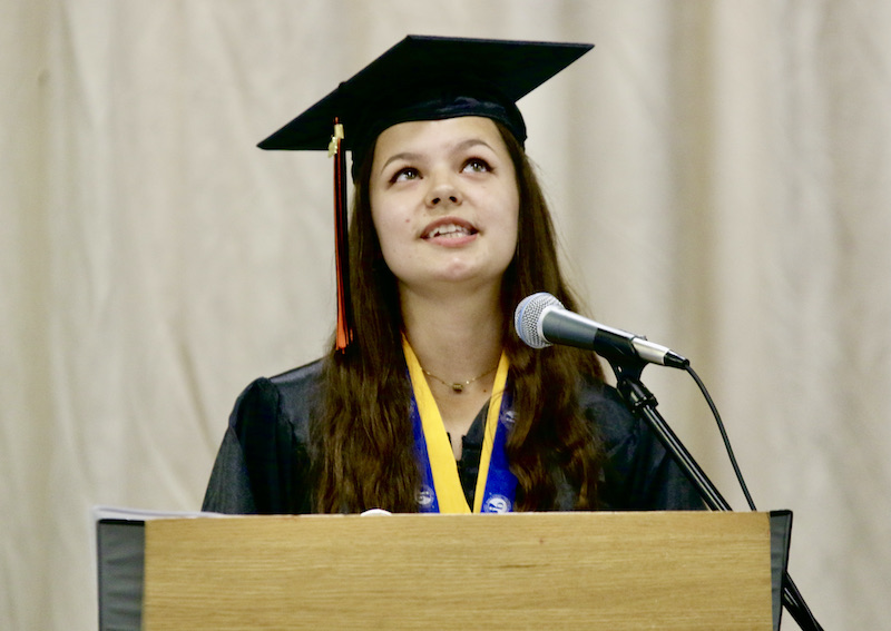 Diana Herasim looks heaven-wards as she talks about her mother during her senior speech. Diana_s mother died of cancer in her homeland of Ukraine four years ago.