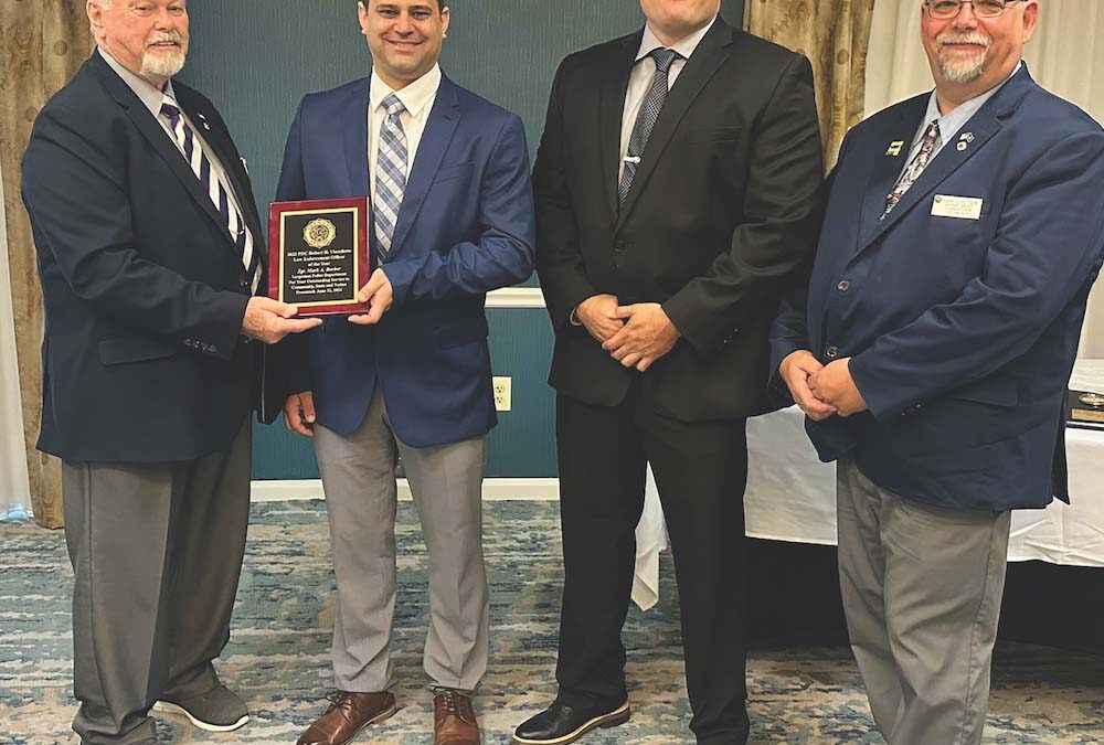 VERGENNES POLICE SGT. Mark Barber, second from left, accepts the Robert H. Vincelette Vermont Law Enforcement Officer of the Year Award from former Vermont American Legion Department Commander Tom Scanlon. Vergennes Police Chief Jason Ouellette, next to Barber, and current Vermont American Legion Department Commander Mark Coultier were also at the award ceremony.