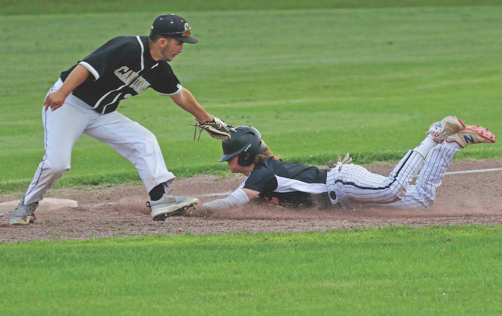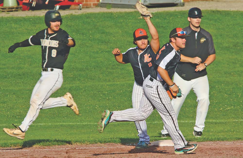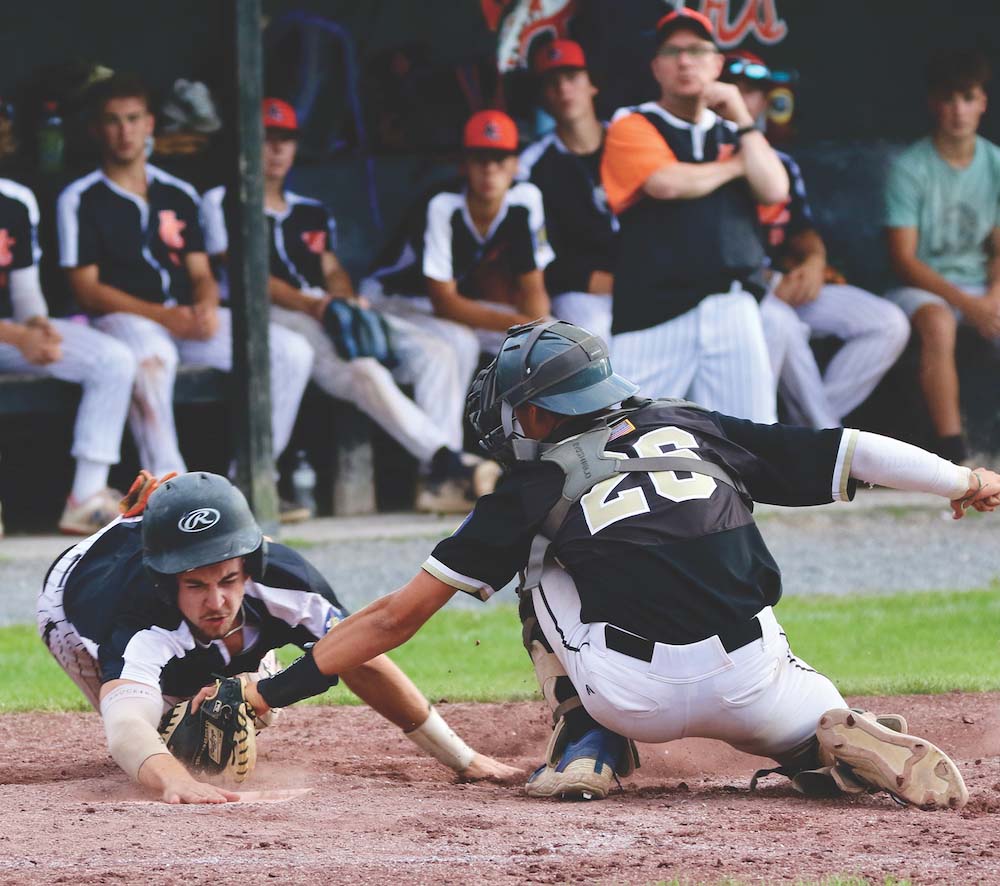 The local nine’s July 18 victory over Colchester, 3-2 in eight innings, saw more suspense. Tembreull drove in Paquette with the first AC run, but Colchester took a 2-1 lead into the eighth. Paquette reached base and made it to second, scoring from there on a Brouillard single with a head-first dive to the plate that allowed him to sneak his hand under a tag that was a microsecond too late.
