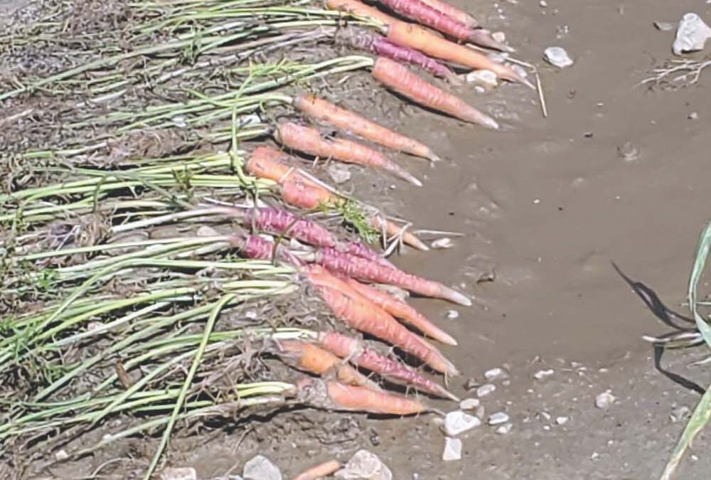 According to Hank Bissell, more than 7 acres of crops were destroyed, farm roads were washed out, and areas of cropland were scoured out as much as three feet deep.