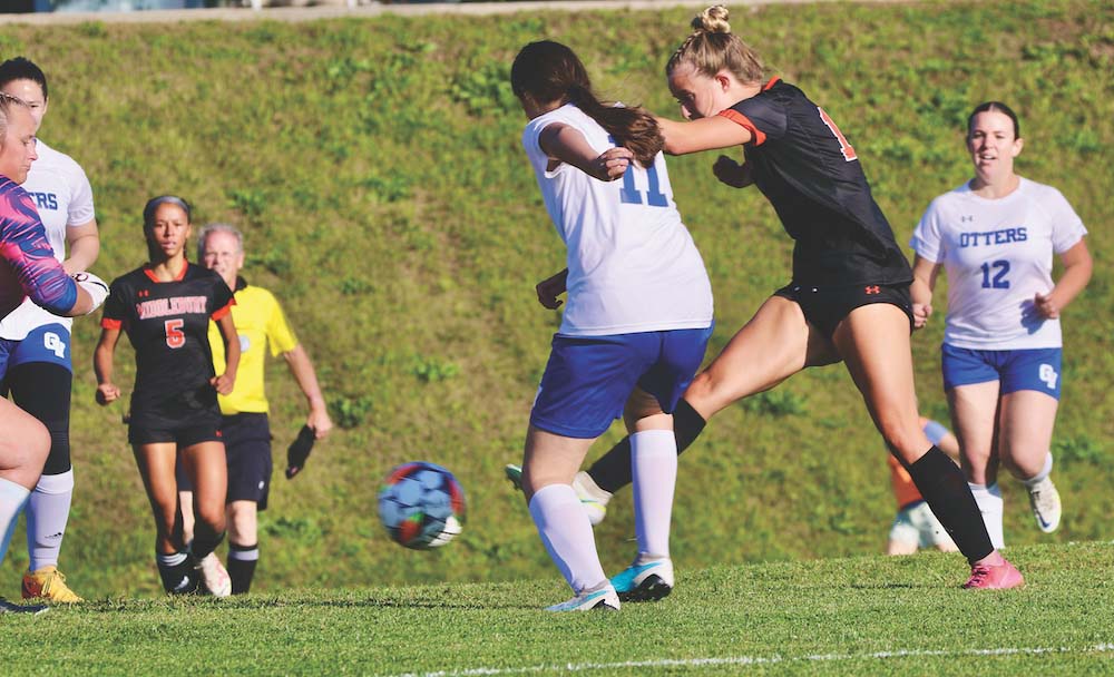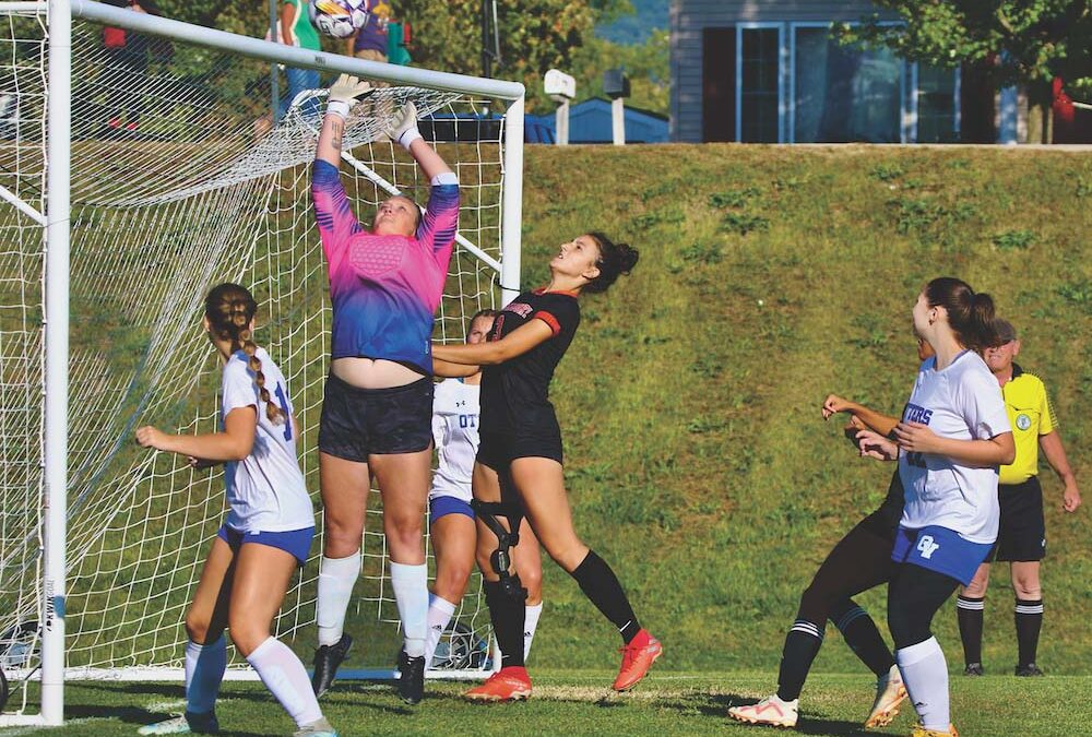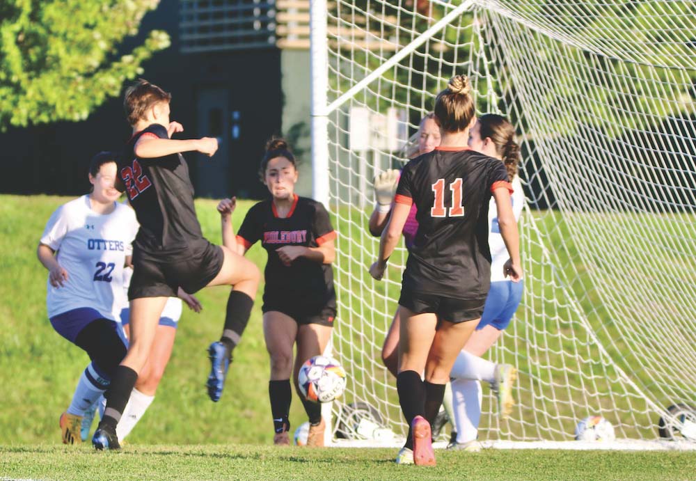 MUHS JUNIOR SOLSTICE Binder one-times home a Meredith Horne corner kick for the second of her three goals in the Tiger girls’ soccer team’s 5-0 victory over visiting Otter Valley on Tuesday.