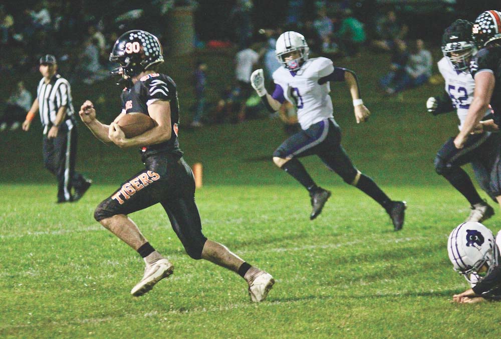 MUHS FULLBACK AVERY Carl leaves the Brattleboro defense in his wake as he scores the third Tiger touchdown in the team’s one-sided, 52-0, win on Friday night.