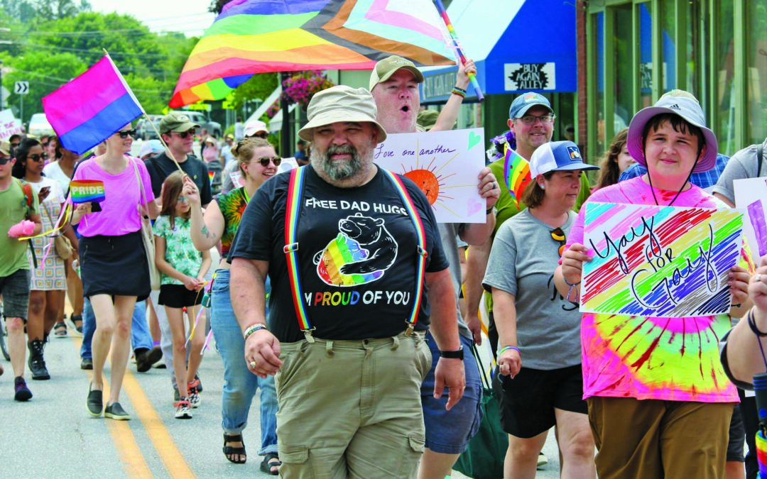A COUPLE HUNDRED people turned out for MiddPride events in downtown Middlebury in 2023. A group from the local teen center, which was responsible for organizing much of MiddPride, led a parade down Main Street.