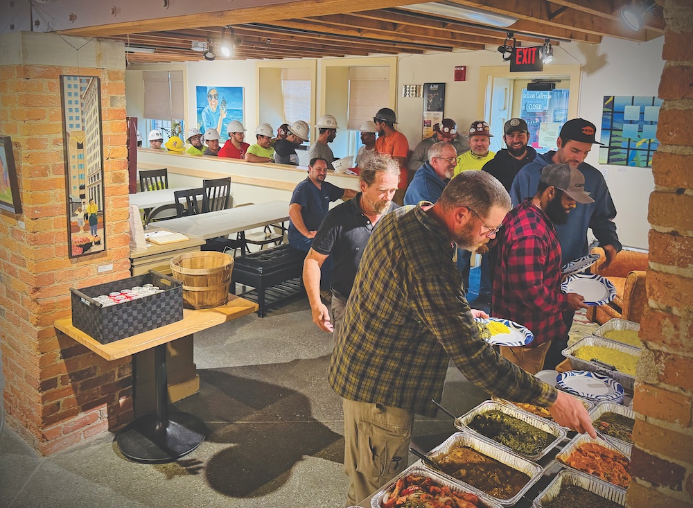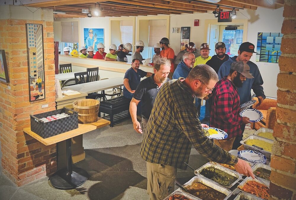 CONSTRUCTION TEAM MEMBERS working on the new wing at Town Hall Theater line up for the regular lunch offered by THT supporter Gale Hurd. The meals are a time when workers and THT staff can sit down and get to know each other.
