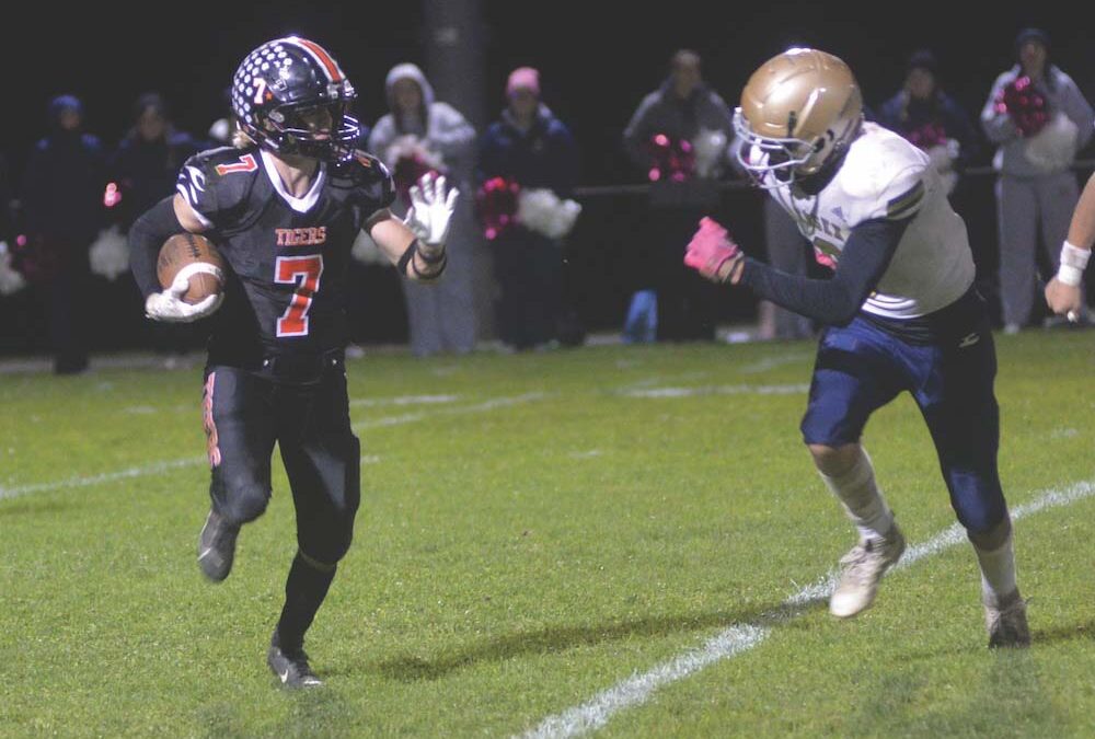 MUHS SENIOR ALEX Sperry runs wide right and prepares to stiff-arm an Essex tackler during the Tiger football team’s home win over Essex on Saturday night.