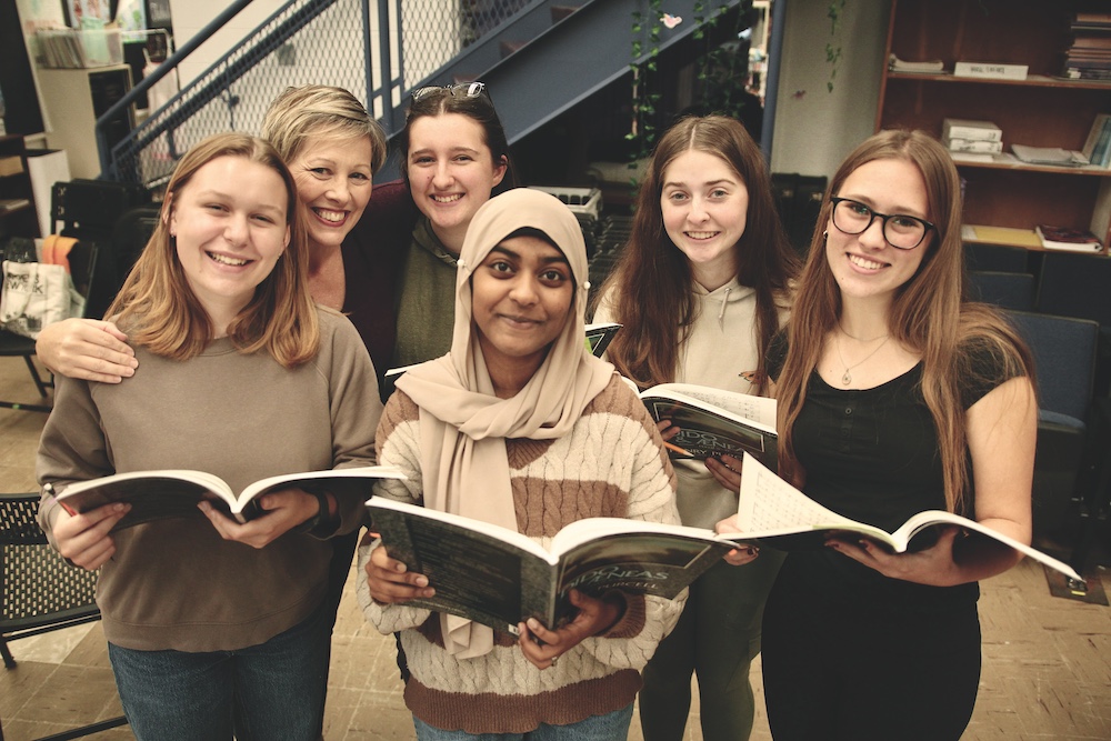 'DIDO AND AENEAS Project” soloists (pictured from left to right) Ella Kozak, Ivy Schuite, Subia Khan, Anya Szczecinski and Lila Brightman rehearse at Middlebury Union High School on Sunday with Sarah Cullins (back left). These five soloists will take the stage at Mount Abraham Union High School with about 140 of their peers from around Addison County on Dec. 13-14, for Youth Opera Company’s annual production of Purcell’s iconic work. INDEPENDENT PHOTO / STEVE JAMES