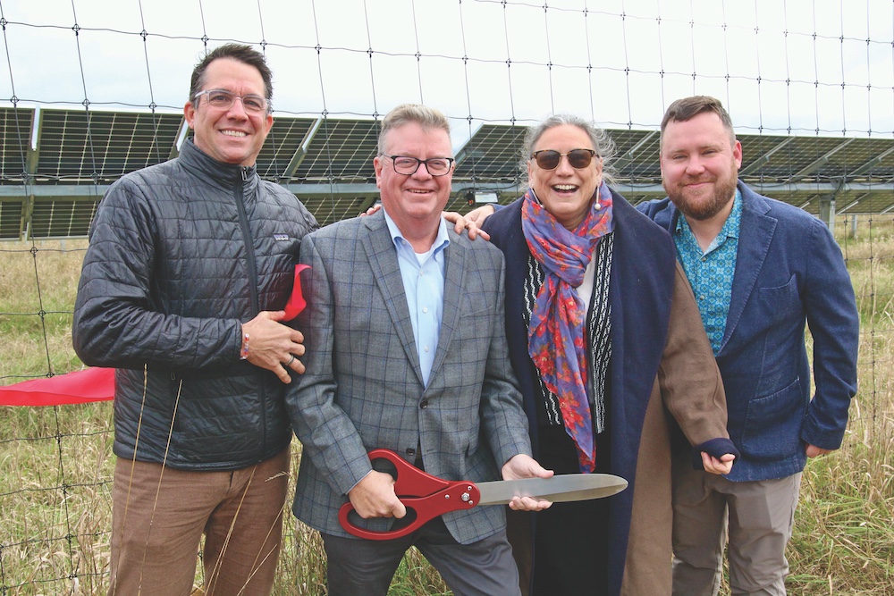 COLLEGE OFFICIALS AND collaborators on Oct. 24, celebrated the activation of a five-megawatt solar array on South Street Extension. Encore founder and co-CEO Chad Farrell, left, Middlebury College Executive Vice President for Finance and Administration David Provost, Middlebury College President Laurie Patton, and Greenbacker Chief Operations Officer Matt Murphy were among those at the ribbon cutting.