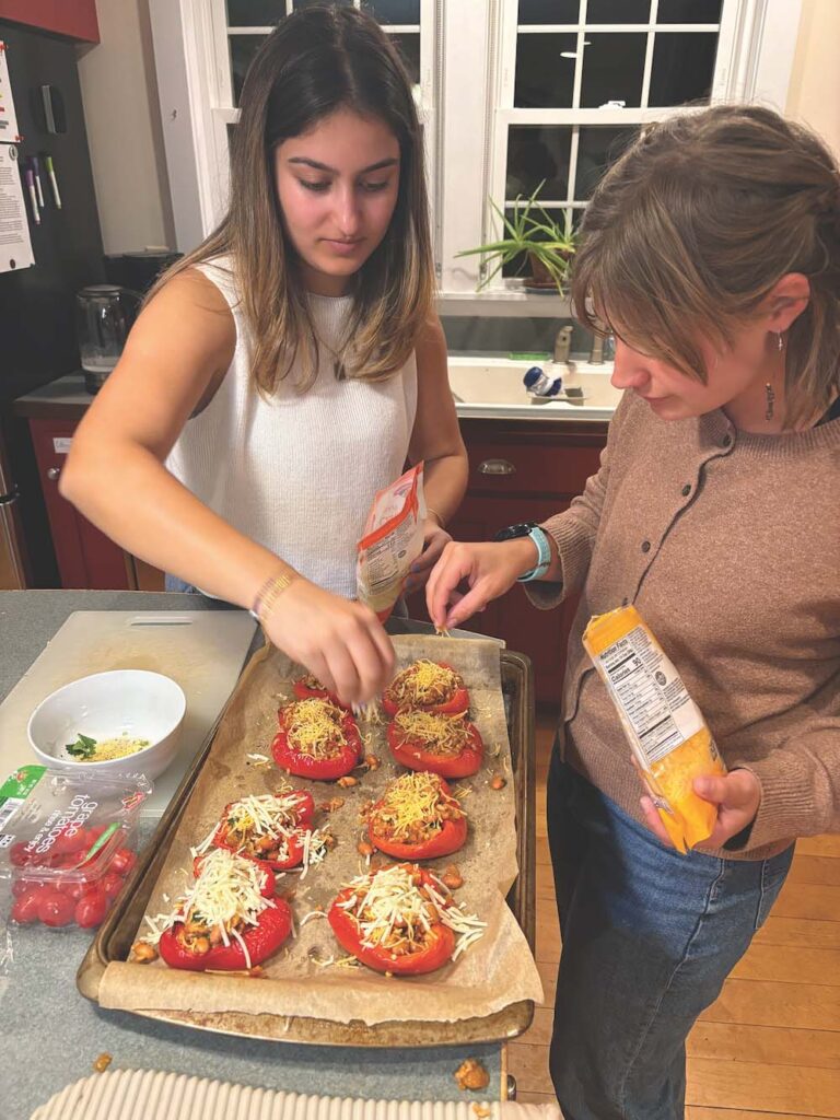 NUTRITION OUTREACH AND Mentoring college student volunteers prepare stuffed bell peppers during a cooking event last month. The program hosts cooking sessions at three schools in the Middlebury area throughout the school year.