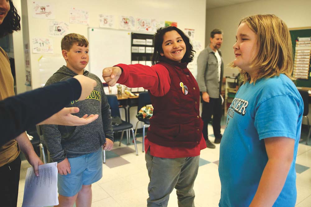 “We might think of Shakespeare as something old and crusty,” said Erin Jones-Poppe, operations and marketing manager for Town Hall Theater, and also the parent of Mary Hogan fifth-grader Sebastian Poppe. “The class [through Courageous Stage] is being taught in a really interactive way that energizes students, and gets them to do things they wouldn’t normally do.”