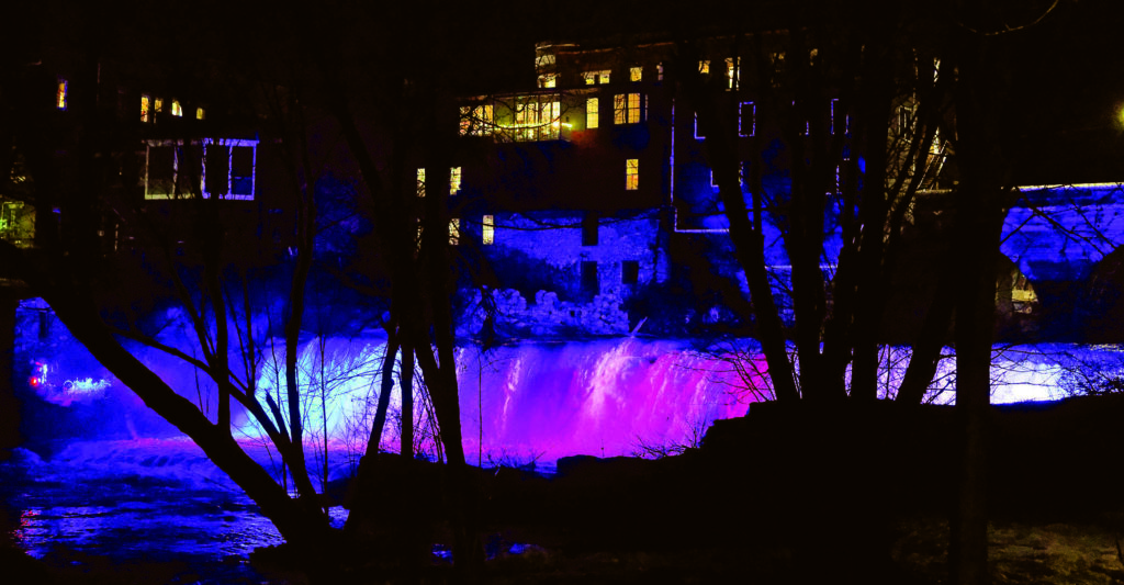 THE OTTER CREEK Falls in Middlebury are lighted with a rotating array of colors to enhance the festive atmosphere during the Midd Night Stroll last December. The Stroll on Dec. 5 is open to everyone, but is specifically marketed to Middlebury College students, who will receive Middlebury Money to spend in town.