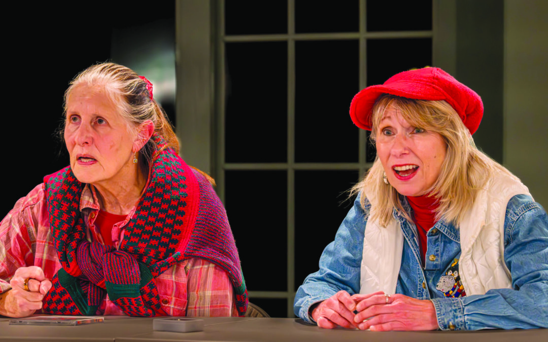 KIMBERLEE MOYER AND Brenda Logee rehearse a scene from “10 Ways to Survive the Holidays” called Holiday Music, about two DJs at an all Holiday music station, maybe too stuck in their old ways... This Middlebury Community Players production will take the stage at the Vergennes Opera House, Dec. 12-15.