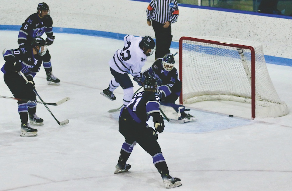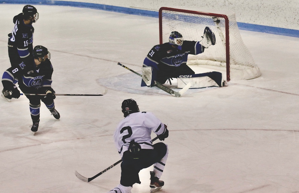 PANTHER SENIOR FORWARD Andrew Seaman beats Marian goalie Tyler Fromolz during the men’s hockey team’s 6-2 first-round win in the LayerEight Shootout in Kenyon Arena on Nov. 29.