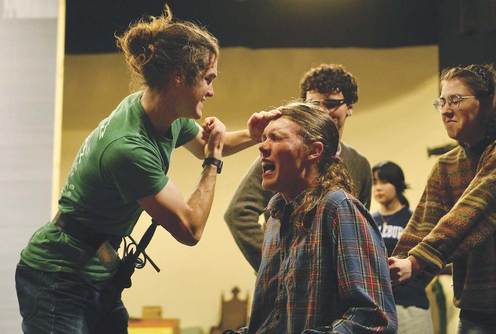 CORNWALL (DANNY SMITH) plucks out the eyes of Gloucester (Owen McCarthy) during a rehearsal of “King Lear” at Middlebury College.