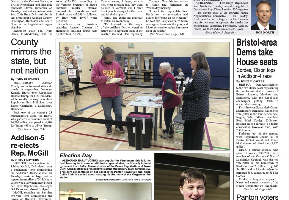 When all the votes had been counted in the race for the two state Senate seats representing Addison County, Huntington, Rochester and Buel’s Gore, incumbent Sen. Ruth Hardy, D-Middlebury, was the top finisher with 11,713 votes, followed by first-time Republican candidate Steven Heffernan of Bristol with 11,644. Bray came away with 10,997; and Landel Cochran of Huntington got 8,210.