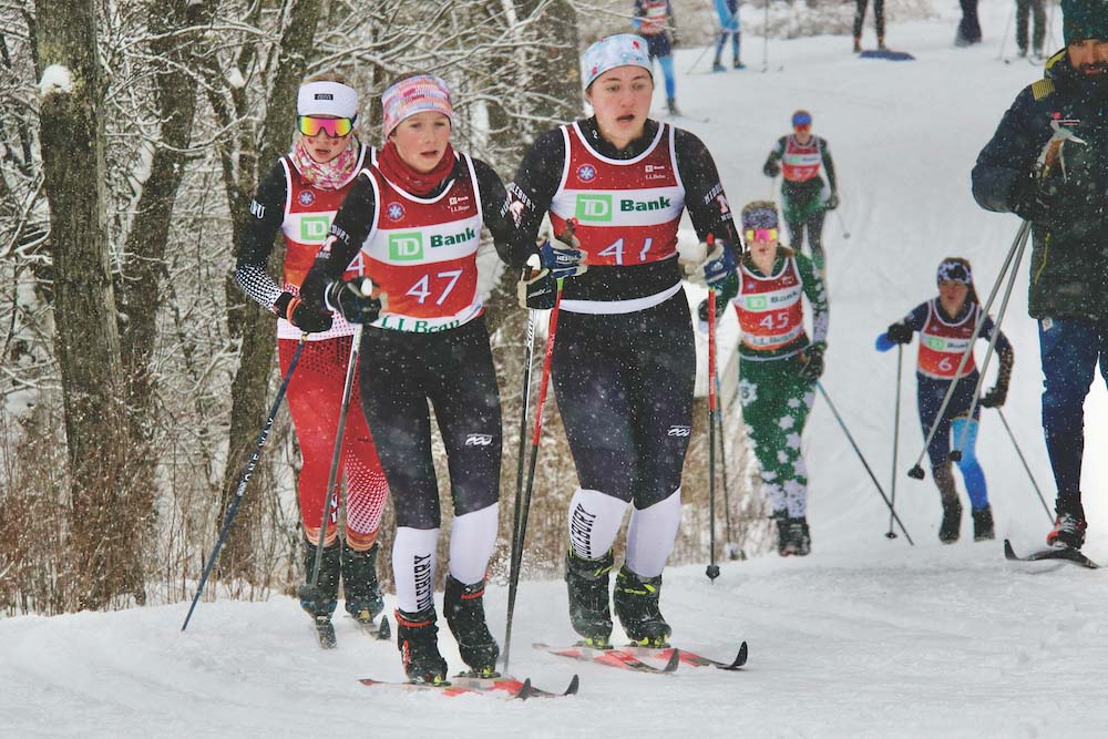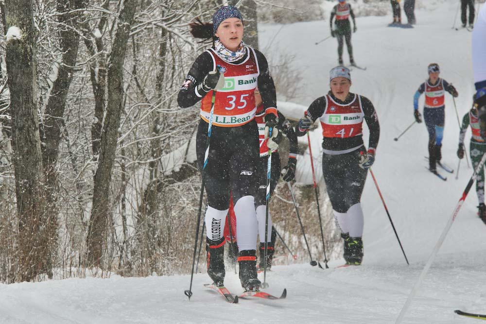 TIGERS MEREDITH Carr-Perlow (47) and Sarah Benz (41) crest an uphill stretch during Saturday’s Nordic racing at Rikert Outdoor Center.