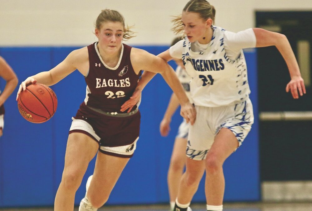 EAGLE SENIOR GUARD Louisa Painter carries the ball up the court as VUHS junior Amelia Giroux applies pressure during Tuesday’s basketball game in Vergennes.