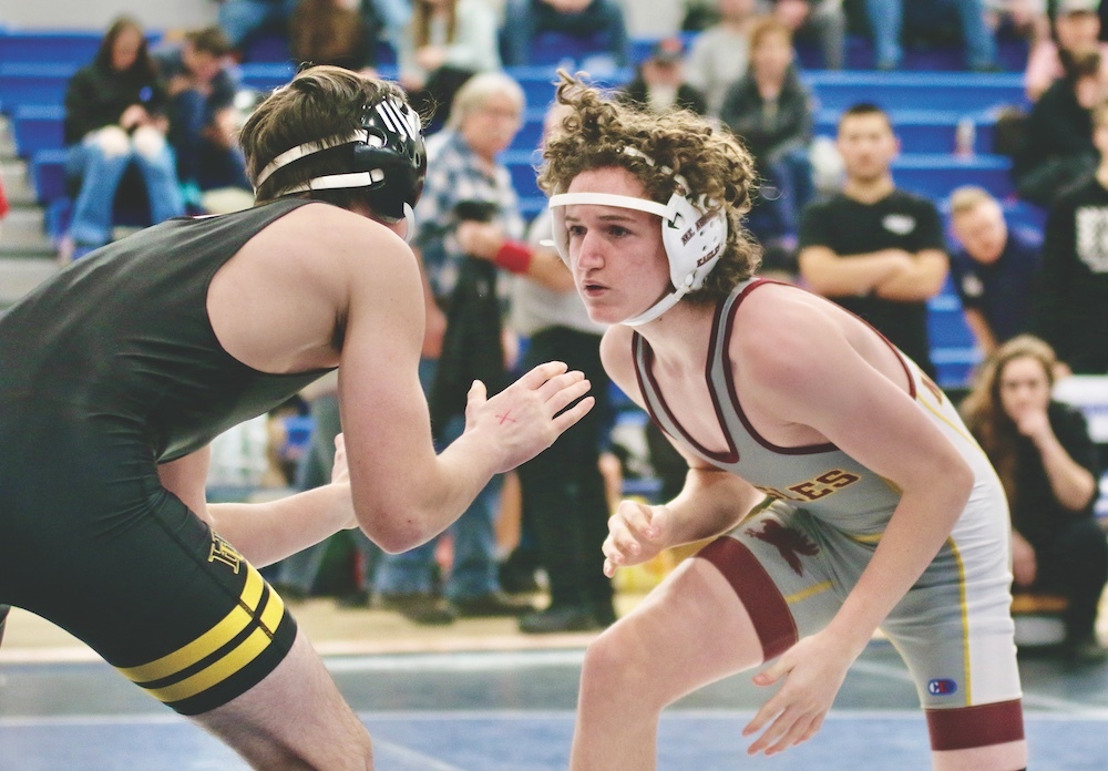 MT. ABE WRESTLER Bradley LeVangie sizes up Harwood’s Eric Whitten in their 126-pound match during Saturday’s tournament in Vergennes. Independent photo/Steve James
