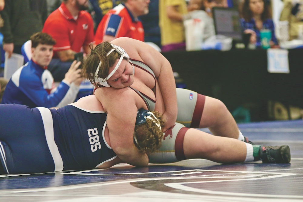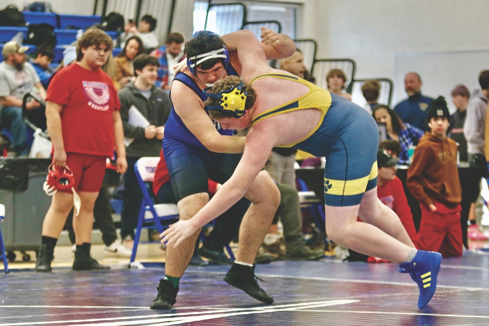 VUHS HEAVYWEIGHT IZAAK Wolniewicz gets the upper hand on ConVal, N.H.,’s Caden Park during Saturday’s wrestling tournament in Vergennes.