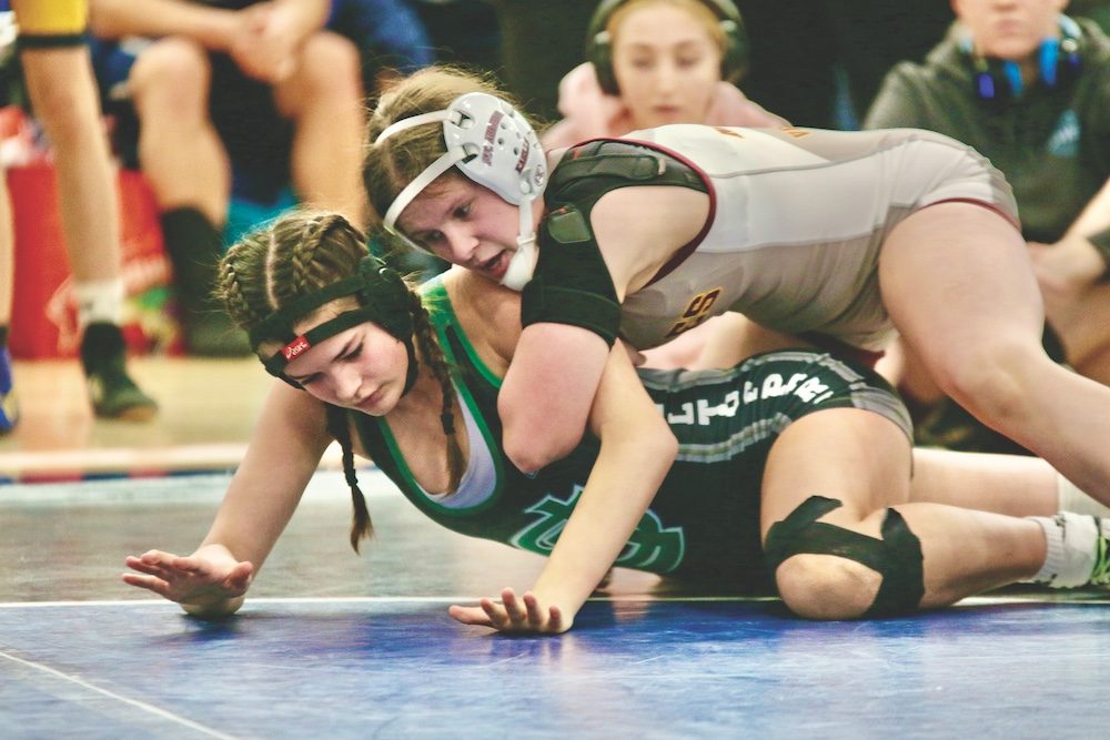 EAGLE HAILEY ISHAM takes charge in her 132-pound match against St. Johnsbury’s Layla McGarvin during Saturday’s wrestling tournament in Vergennes.