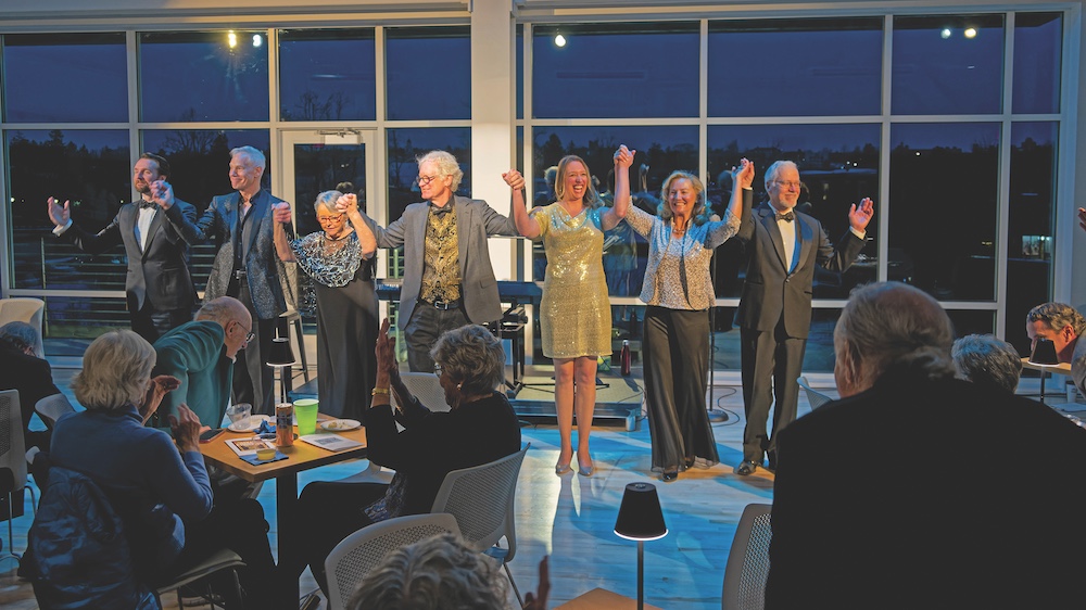 DOUG AND DEBBY Anderson, center left, join hands with performers Nathaniel Rothrock, Stephen Rainville, Kim Anderson, Mindy Bickford and Bill Bickford at a cabaret performance in the new THT space.