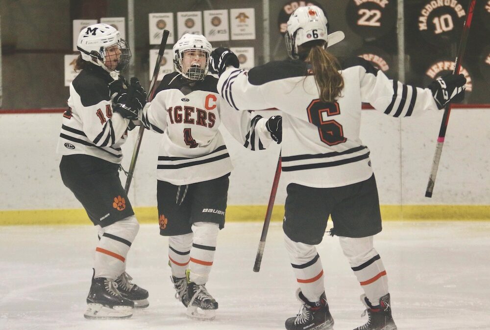 The MUHS girls’ hockey team scored four pretty goals and got outstanding goaltending from senior Ruby Hubbell vs. Rice on Friday. But the Green Knights erupted in the third period to skate away with a victory.