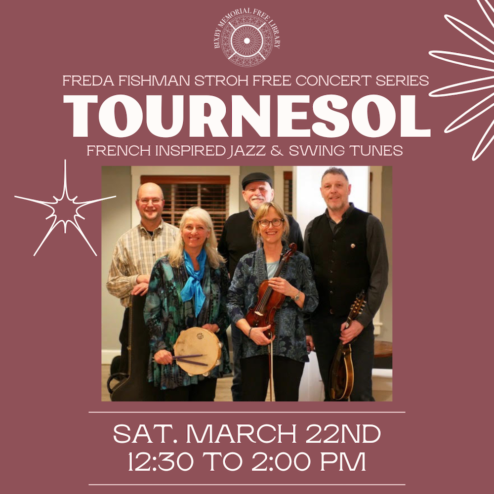 Returning for its second year, the Bixby Library in Vergennes will kick off the Freda Fishman Stroh Free Concert Series on Saturday, March 22, from 12:30-2 p.m., with lively French-inspired jazz and swing tunes from Tournesol.