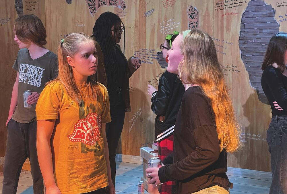 ADDISON REPORTORY THEATER’S Lucas Flinner, left, and Jeremy Holzhammer act out a scene while a group of castmates network at the side of the stage during a recent rehearsal of ART’s original scary play, “I’ll Tell You a Secret,” to be staged at the Patricia Hannaford Career Center March 27-29.