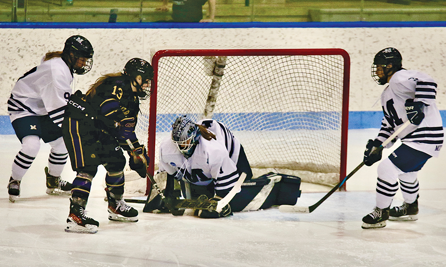 NAZARETH GOALIE MCKINLEY Hoff holds the short side to deny Panther senior Molly MacQueen during the Middlebury College women’s hockey team’s 1-0 NCAA D-III quarterfinal win.