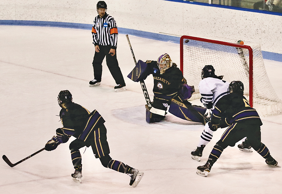 PANTHER JUNIOR GOALIE Sophia Will thwarts Nazareth forward Alexis Kindred for one of her 23 saves on Saturday during the Panther hockey team’s 1-0 NCAA D-III quarterfinal win.