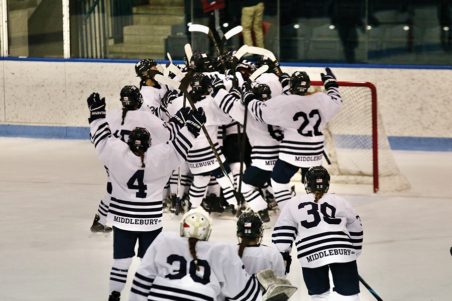 MEMBERS OF THE Middlebury College women’s hockey team celebrate their NCAA D-III home quarterfinal shutout win on Saturday by mobbing goalie Sophia Will, who is somewhere in the crowd.