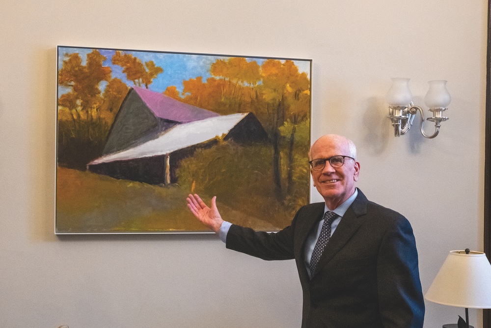 SENATOR PETER WELCH pictured with a Wolf Kahn painting hosted in his office. Kahn lived in West Brattleboro for 50 years. He passed in 2020 at the age of 92.
