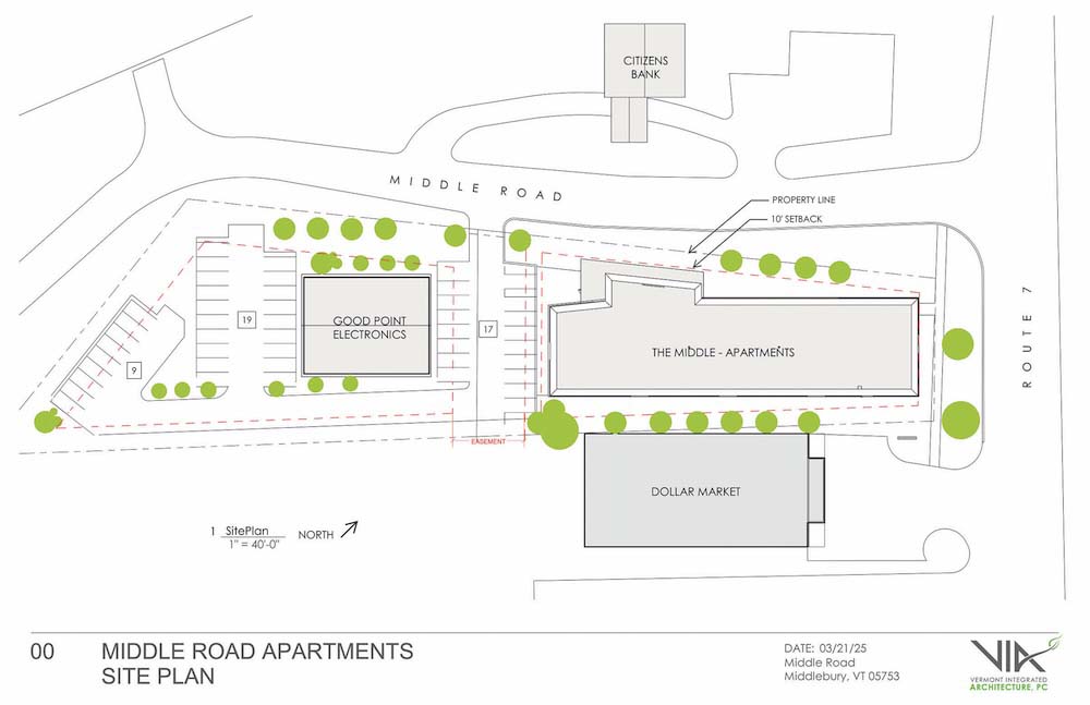 Folks living at Middle Road Housing would have convenient access to Middlebury schools, The Centre (Hannaford’s) shopping plaza, Route 7, and state offices located in South Village Green, according to Rosenzweig.