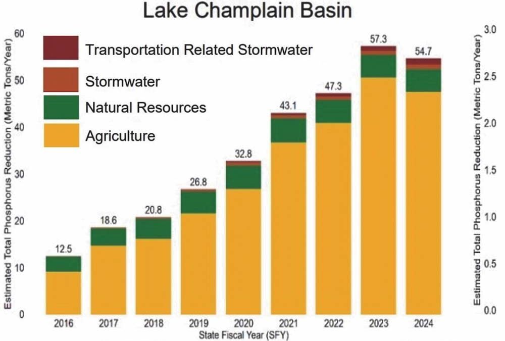 Annual estimated total phosphorus load reduction (metric tons per year) associated with clean water projects by land sector. Image courtesy of the state of Vermont