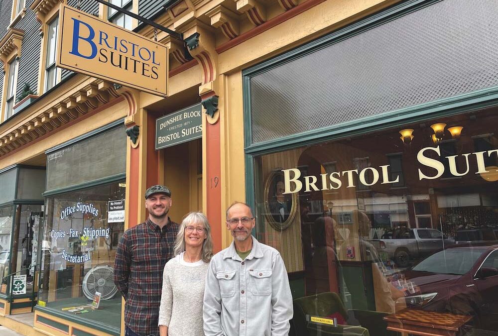 JUSTIN SANDHERR, LEFT, purchased Bristol’s Dunshee Block — and resident businesses Bristol Suites and the Vermont Marketplace — from Carol and Tom Wells in February. He’s now working with innkeepers Niko Pruesse and Mark Adams and fellow staff to make slight updates to the business and continue collaborating with the community.
