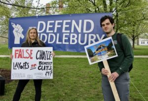 college faculty protest Economics professor Tanya Byker and student Cole Siefer (his sign is reference to the Midd school in Calif) May 8, 2025 Share this story: